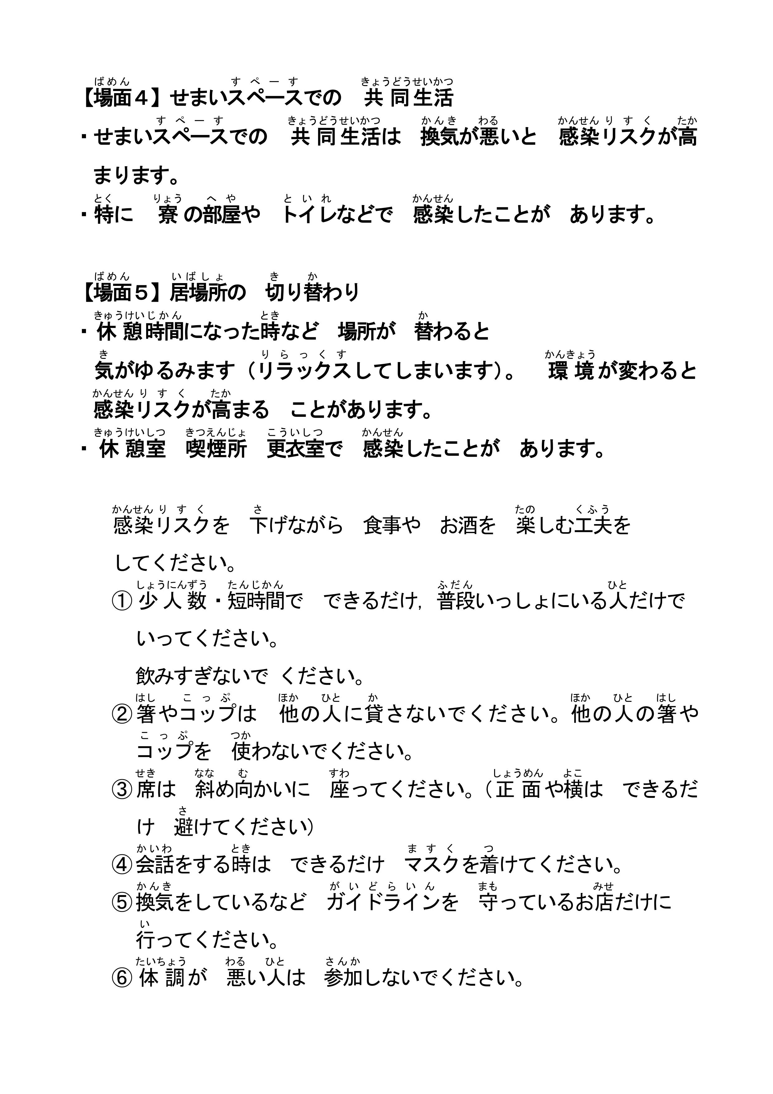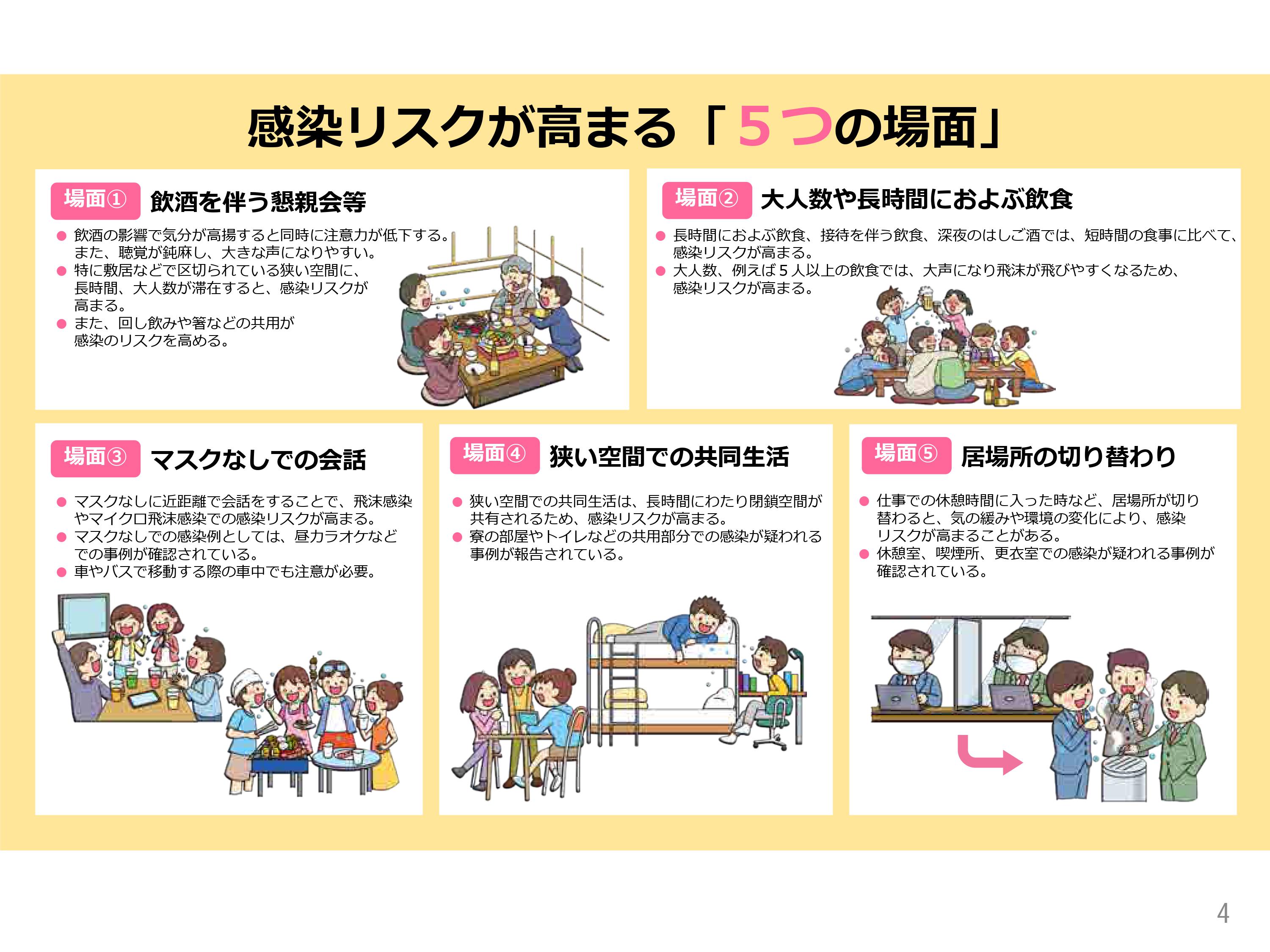 新型コロナウイルスを広げないために5つの場面をさけましょう