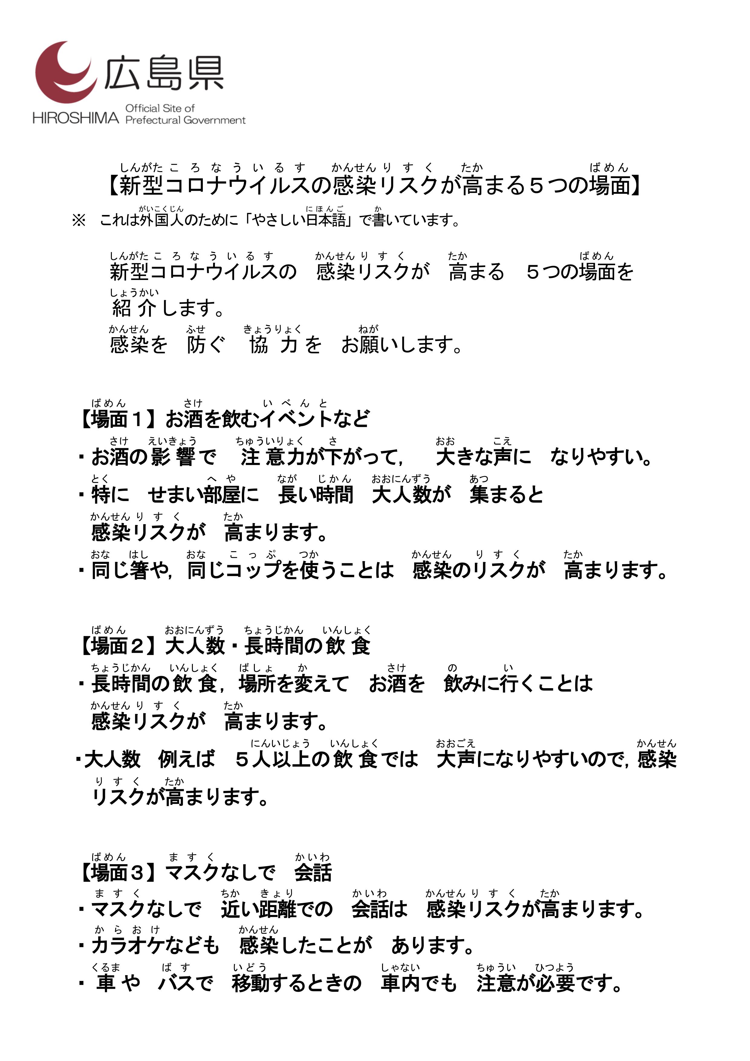 広島県から、新型コロナウイルスを広げないためのお願いが届いています。
