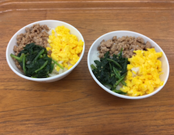また、スポーツ校は、本校講師 玉利紗綾香先生監修の、試合前日に食べると良い「勝ち飯」三色そぼろ丼でした。